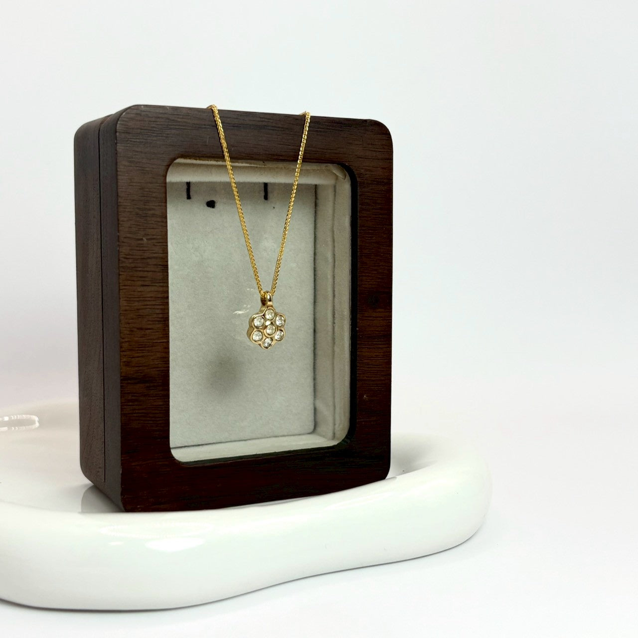 這款 1990 年代 Dior 經典復古項鍊,以鍍金金屬為底,六顆晶鑽錯落環繞中央主石,構成小巧立體的花朵輪廓。水鑽閃爍著柔和而乾淨的光澤,像是老照片中靜靜綻放的法式優雅。