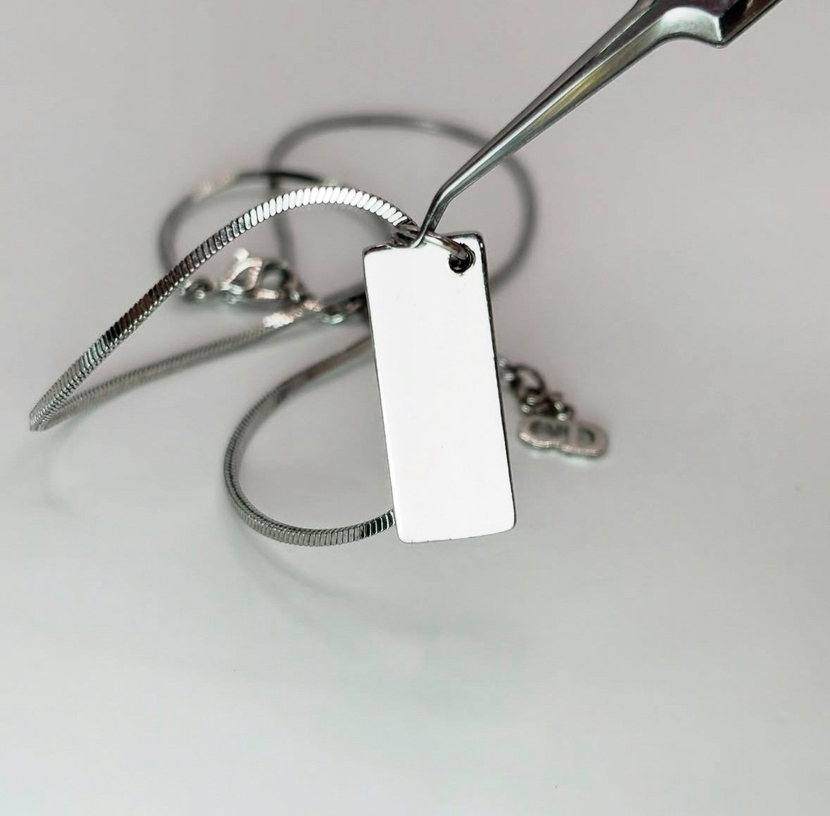 以鍍銀鍊搭配長方形墜飾,壓印滿版 Dior 字母圖騰