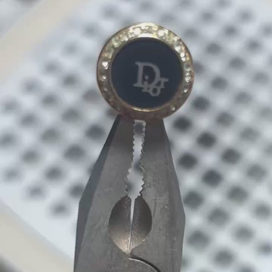 這對 1990 年代 Dior 復古耳夾,以霧黑底面襯托經典「Dior 字母 logo」,外圈點綴圓形晶鑽